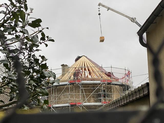 Quand on se lance dans le changement de la toiture d’un tour de 1550, autant dire qu’il faut faire les choses bien pour respecter le patrimoine. Le choix de compagnons et de l’Arbre à l’Etrier s’est imposé naturellement lors des premiers échanges. Je dois dire que le résultat magnifique est au delà de mes espérances. Chaque détail transpire le savoir faire et la qualité. Un vrai travail de passionnés. Il faut savoir attendre son tour, mais la patience est largement récompensée. Dommage que je n’ai pas une deuxième tour, le spectacle de la construction de la charpente vaut le détour. Un grand merci à Mr et Mme qui avec leur équipe savent allier, le beau, le bien et l’agréable.